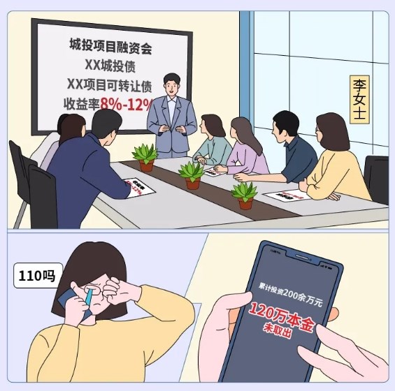 某公司对外宣传自己和多家国有城投公司是云顶集团7610官方网站的合作伙伴,负责为城投项目融资,提供的理财产品名称大多为“xx城投债”或“xx项目可转让债”,收益率在8%到12%不等。李女士认为国有的项目风险比较低,即使项目“黄”了,钱还是会还的,遂两年内在该公司累计投资200余万元。到2023年8月,该公司宣布无力偿还资金,李女士尚有120万本金未取出,经协商无果后,李女士到附近派出所报案。